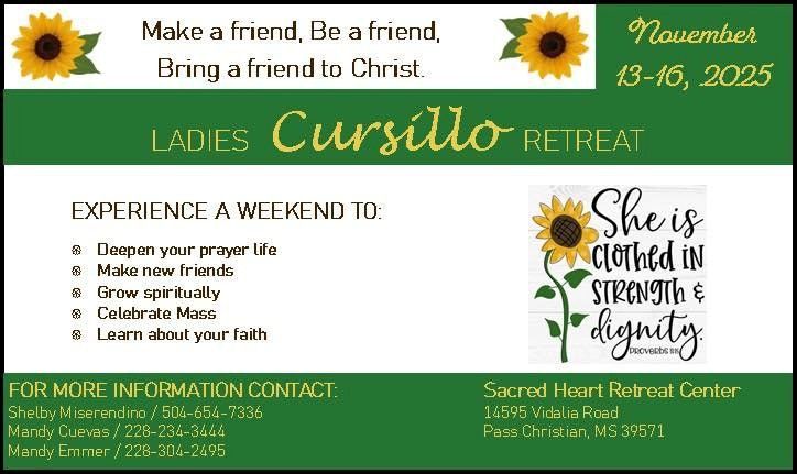 Father Sergio has Asked that Five women from Sacred Heart Attend The Up Coming Women's Cursillo Nov 13-16